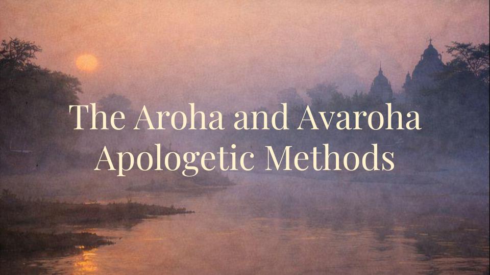 I am not saying that the aroha apologetic method cannot be used at all. In certain cases it might be helpful as an additional strategy. But it should never be used without understanding the avaroha method, i.e. the proper Vedic revelational epistemology with which we can present the strongest possible case that is also fully in line with our Vaisnava worldview: