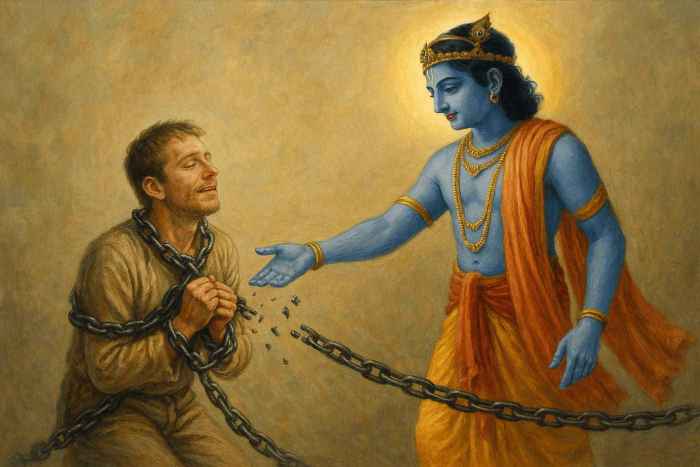 Even the laws of karma, which appear to be imposed from above, are ultimately designed to liberate, not subjugate. Krishna arranges the system of karma not to punish arbitrarily, but to guide each soul back toward its eternal, blissful function. As long as the soul acts against its true nature, it suffers. Krishna’s goal is not to dominate but to help each soul reconnect with its svabhāva — its eternal nature as a servant of God — which alone brings true happiness. The structure He gives is not oppression, but orientation.