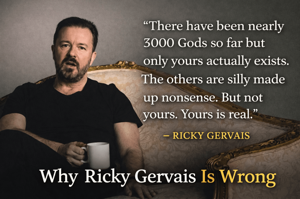 Public statements about religion are often delivered with a mixture of humor and provocation, and remarks by figures such as Ricky Gervais are no exception. His well-known line – that there have been thousands of gods, that the theist rejects all but one, and that the atheist simply goes one god further – is clearly intended, at least in part, as a comedic observation.